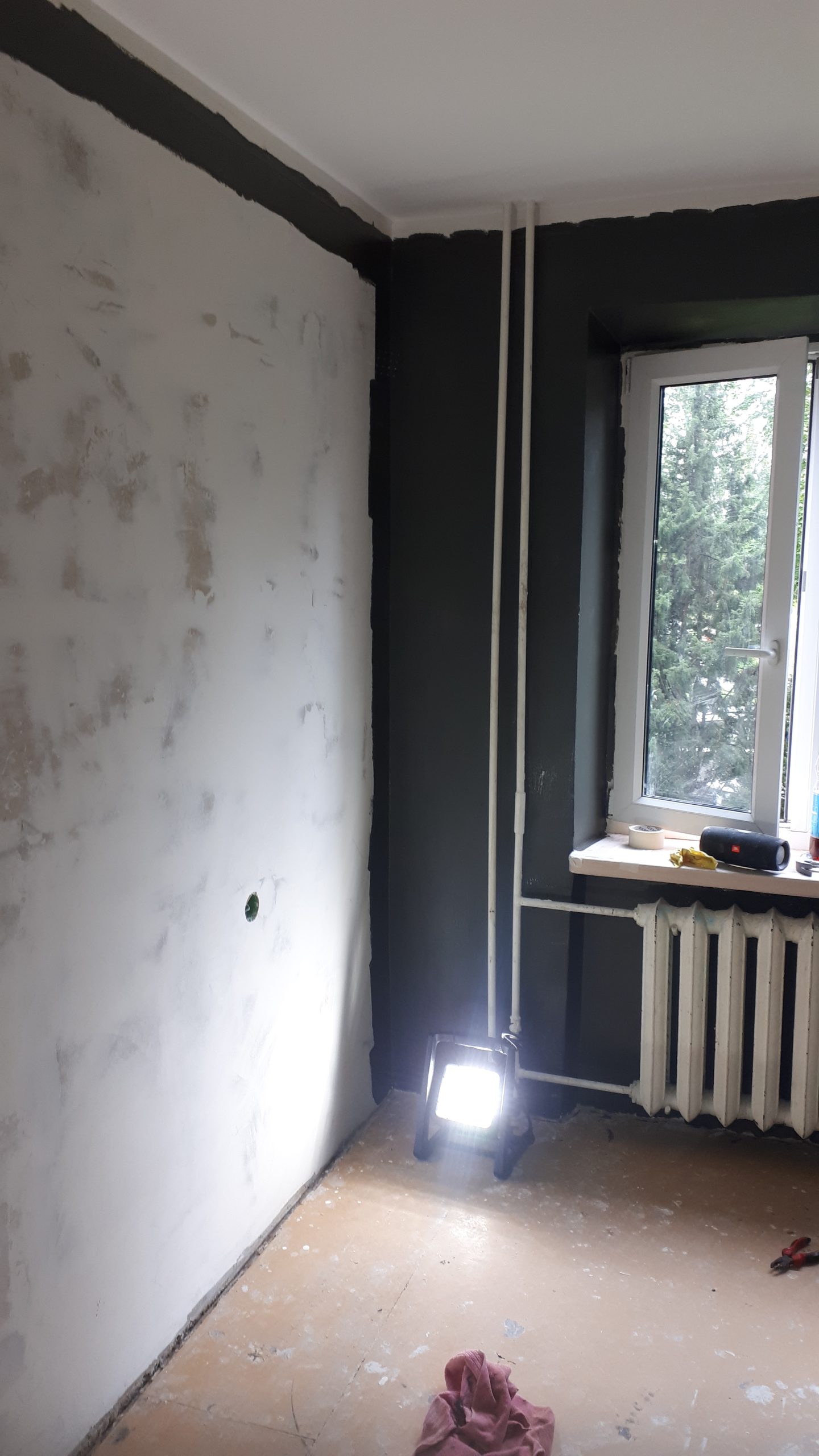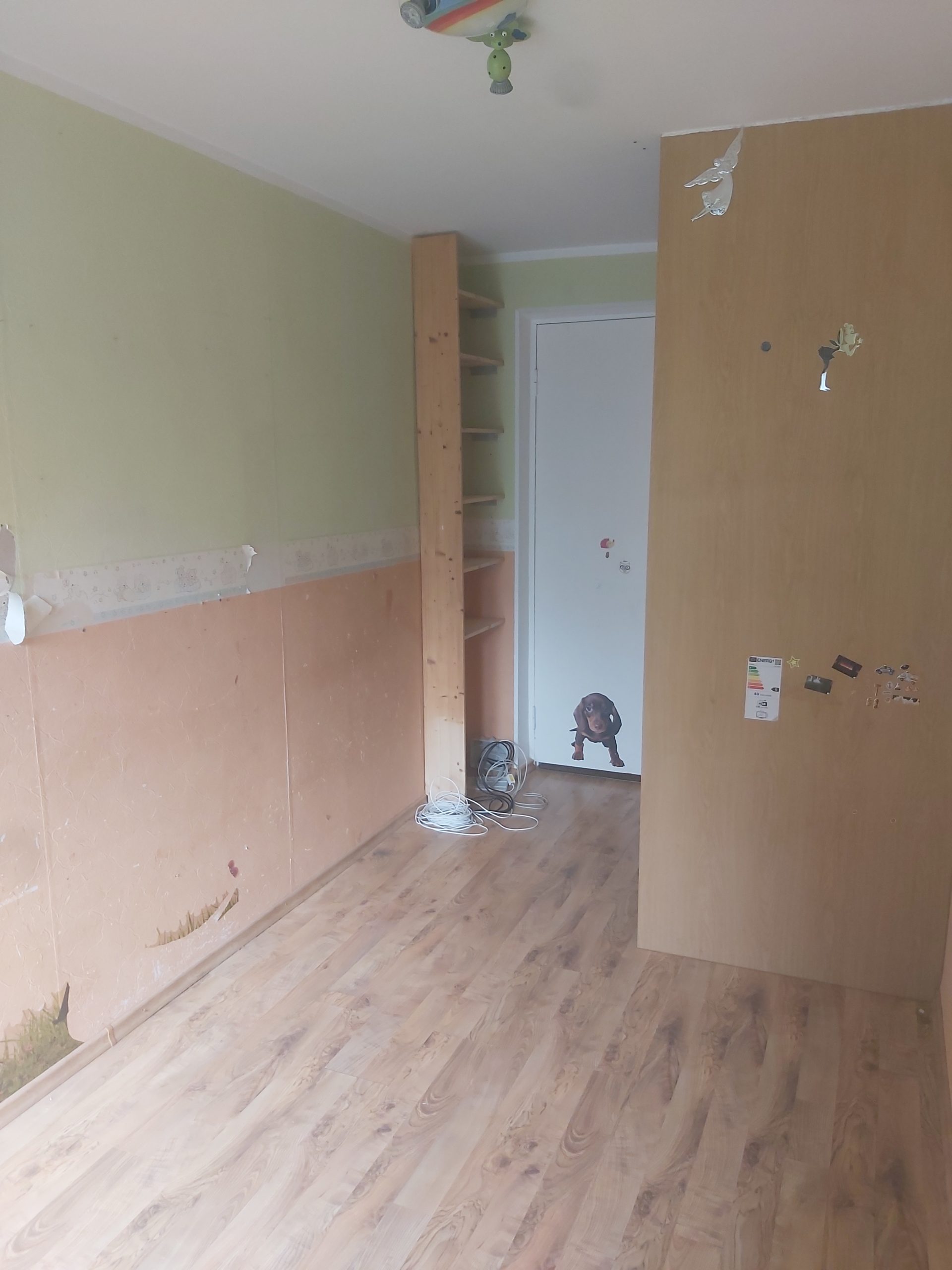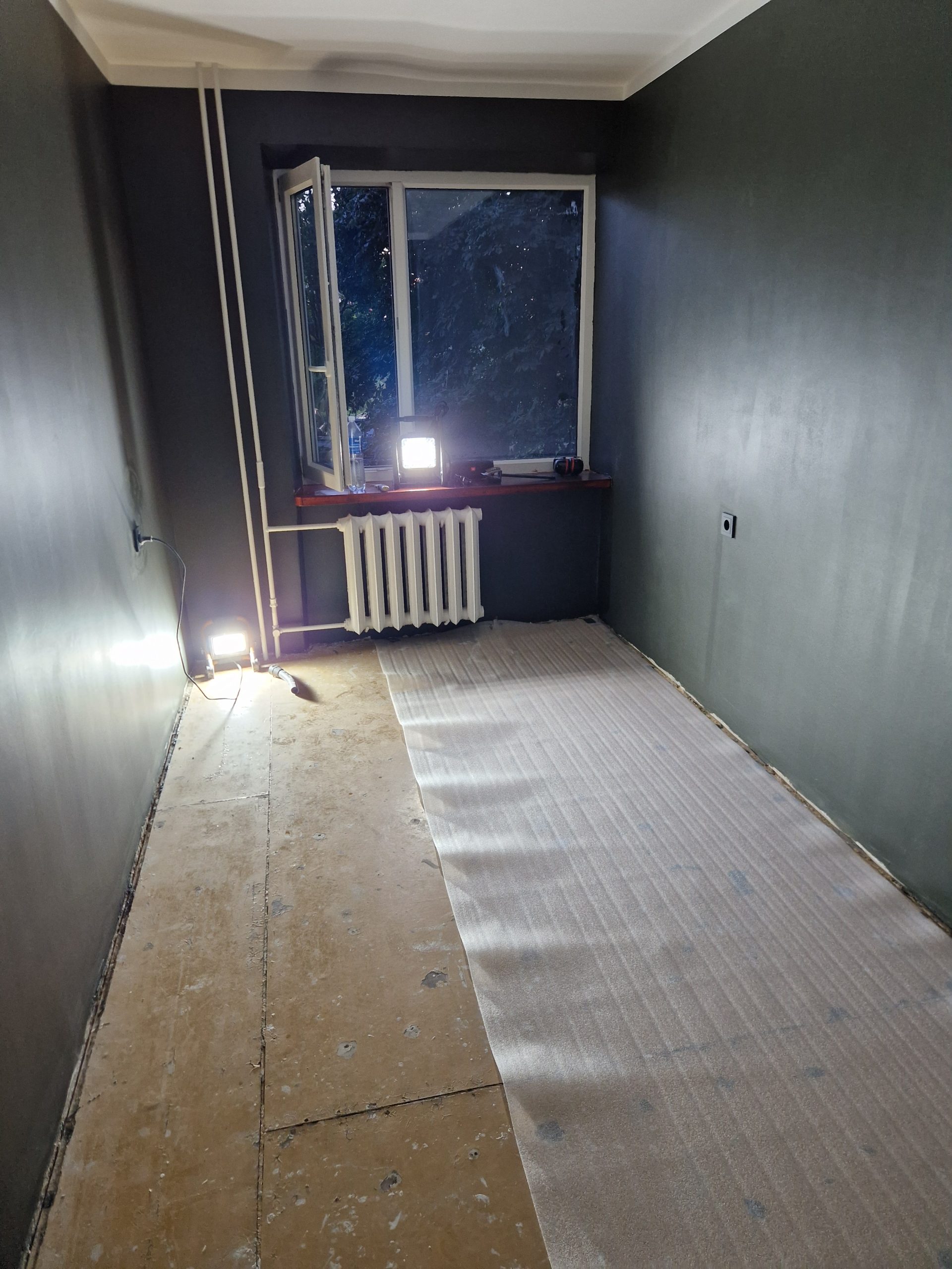 All black walls, with dark oak parquet and a white ceiling. The room is around 11 m2.
